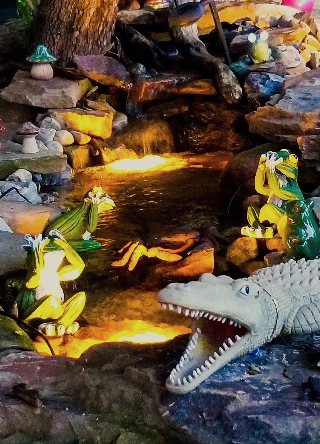 Landscape with a small waterfall or stream flowing over rocks, illuminated by yellow lighting, adjacent to a gray wall and a slope with soil and stones.